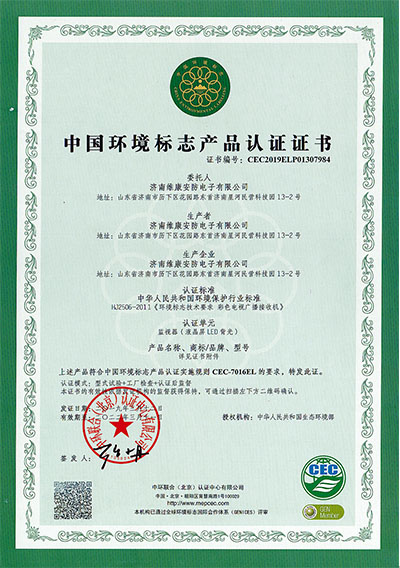 公司通過了CCC認(rèn)證、節(jié)能認(rèn)證、環(huán)境標(biāo)志產(chǎn)品認(rèn)證、公安部安全與警用電子產(chǎn)品質(zhì)量檢測中心檢測報告(CNAS認(rèn)證) 、ISO9001、14001、18001、CE、CB、FCC、ROHS、抗震防塵等多項資質(zhì)認(rèn)證,并入選《政采節(jié)能產(chǎn)品清單》。